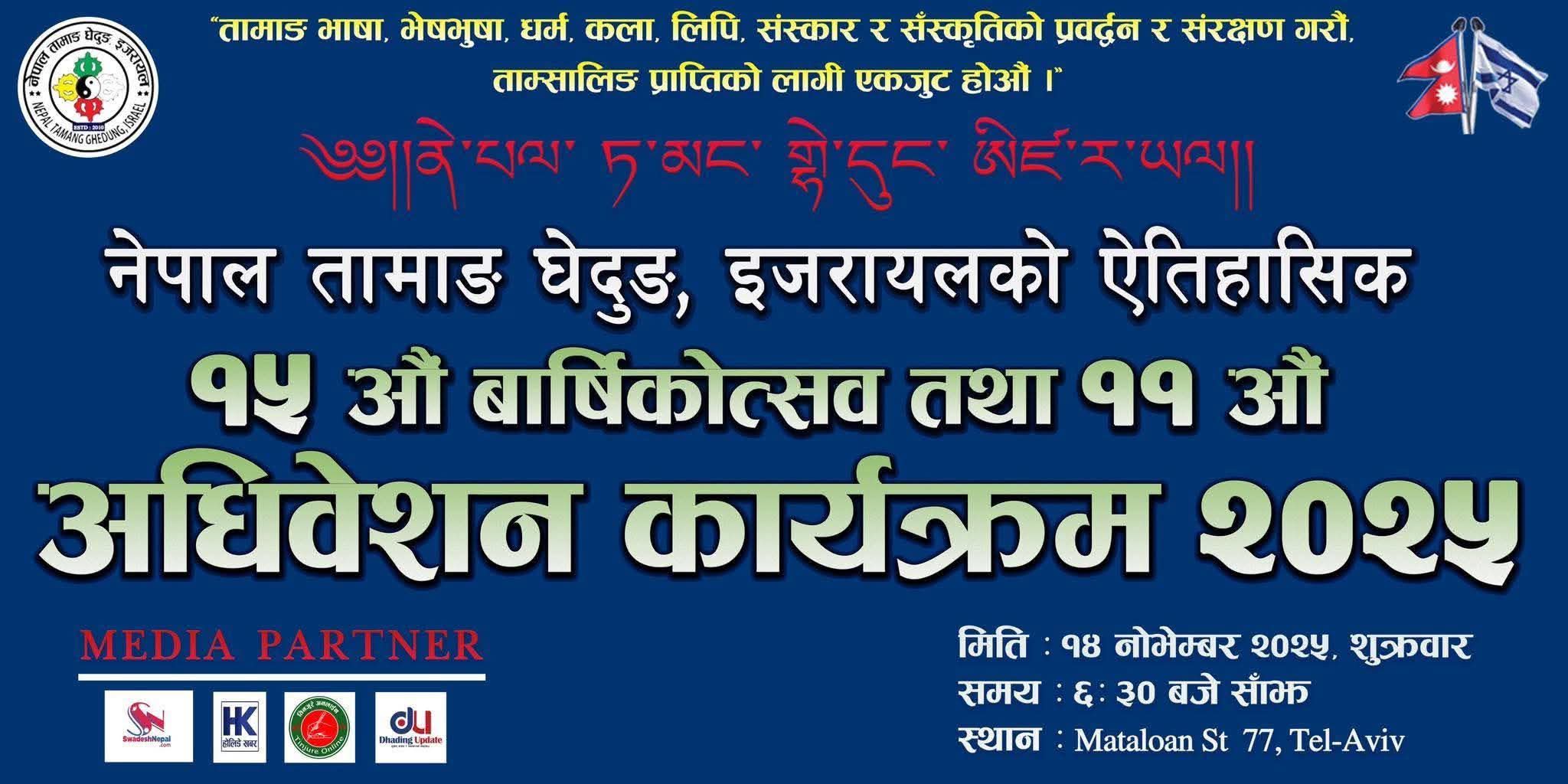 नेपाल तामाङ घेदुङ इजरायलको पन्ध्रौँ वार्षिकोत्सव तथा एघारौँ अधिवेशन आगामी १४ नोभेम्बर २०२५ शुक्रबारको दिन हुने भएको छ ।