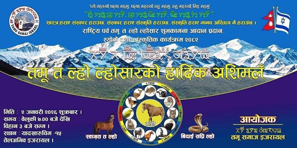 तमु समाज इजरायलद्वारा तमु ल्होसार २०८२ को अवसरमा आउदो  तमु ल्होसार मनाउने भएको छ आउदो  २ जनवरि  २०२६ शुक्रबार तेल-अभिब स्थित यादखरुचिम १५ को हलमा साँझ ७:०० बजेदेखि राष्ट्रिय पर्व तमू  ल्होसार  तथा सांस्कृतिक कार्यक्रम २०२६”मनाउने भएको छ !